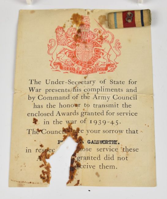 British Army WW2 group of six medals attributed to 5675209 Pte Frank Victor Galsworthy 1/5 The Queen's Regiment (West Surrey) comprising 1939/1945 Star, Africa Star (8th Army clasp), Italy Star, France & Germany Star, Defence and War medals, mounted in a glazed frame, together with a cap badge and medal ribbon for Africa Star. Pte Galsworthy died on 28th February 1945