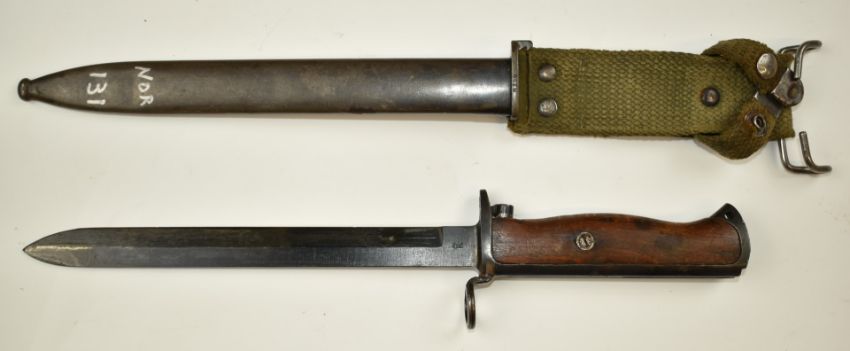Norwegian 1894 pattern Krag Jorgensen bayonet altered to fit US M1 carbine, with 20.5cm blade, scabbard stamped 8174 and frog. PLEASE NOTE ALL BLADED ITEMS ARE SUBJECT TO OVER 18 CHECK ON COLLECTION OR DELIVERY