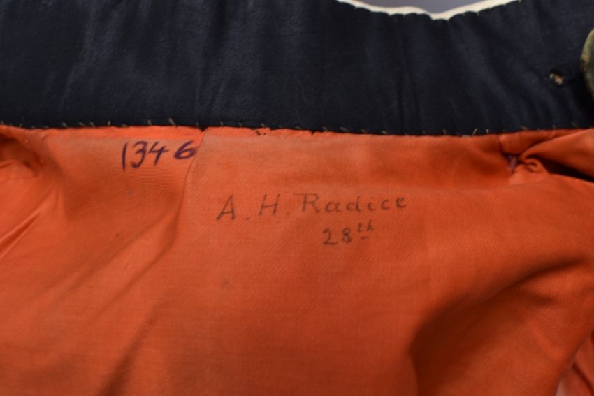 British Army officer's scarlet jacket attributed to Captain A H Radice, 1st Battalion Gloucestershire Regiment, together with his dress cap with bullion and wire badgesConsigned by the Soldiers of Gloucestershire Museum Trust