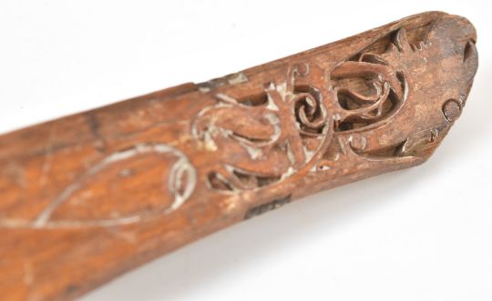 Two Borneo head hunter's wooden sword sheaths, one with crude carving, longest 62cm. PLEASE NOTE ALL BLADED ITEMS ARE SUBJECT TO OVER 18 CHECK ON COLLECTION OR DELIVERY