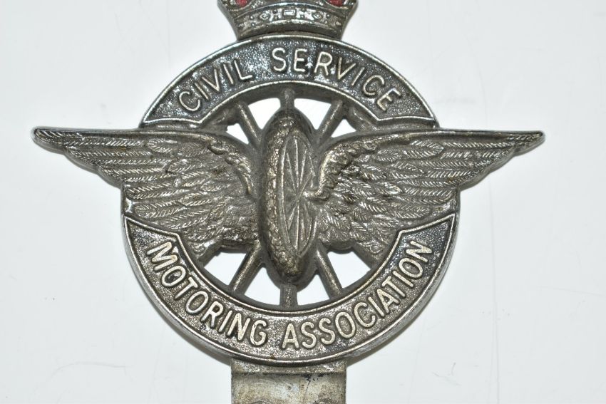 Two vintage or classic car badges comprising Civil Service Motoring Association with crown finial and Royal Automobile Club (RAC)