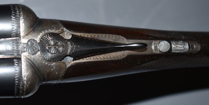 J & W Tolley 12 bore side by side ejector shotgun with named locks, border engraved locks, underside, trigger guard, top plate, thumb lever and fences, chequered grip and forend, double trigger and 28 inch barrels ½ and unchoked, overall length 112.5cm, length of pull 36.5cm, serial number 8969. PLEASE NOTE THAT A VALID RELEVANT FIREARMS/SHOTGUN CERTIFICATE IS REQUIRED TO HANDLE/PURCHASE THIS ITEM.