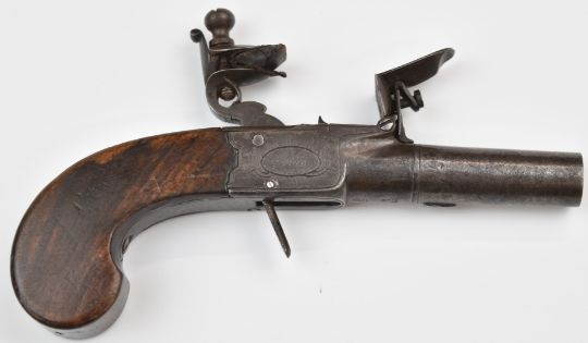 Twigg of London flintlock pocket pistol with named and engraved locks, folding trigger, shaped wooden grips and 1.75 inch smooth bored turn off barrel, overall length 16cm.