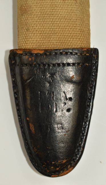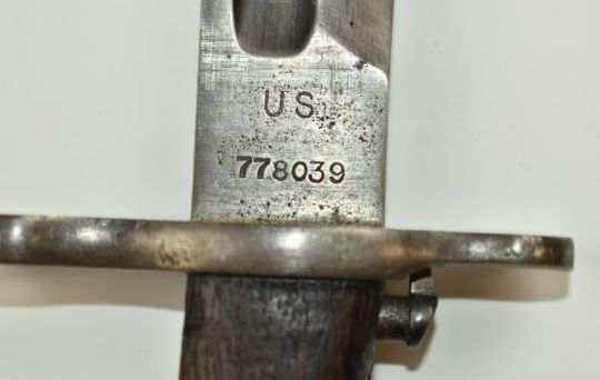 American 1905 pattern sword bayonet for the 1903 Springfield rifle, SA 1918 and US 778039 to ricasso, with 40cm fullered blade and canvas and leather covered scabbard. PLEASE NOTE ALL BLADED ITEMS ARE SUBJECT TO OVER 18 CHECK ON COLLECTION OR DELIVERY