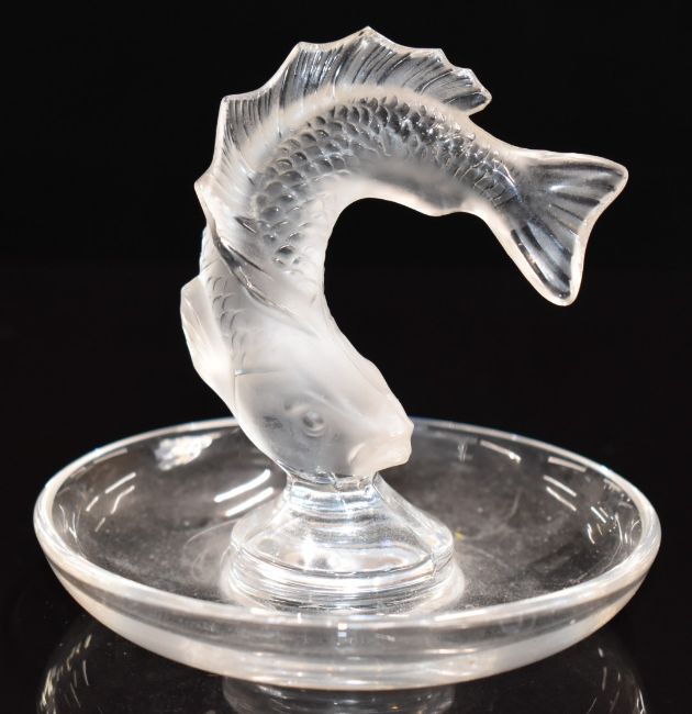 Lalique frosted and clear glass pin dish or ring holder decorated with a leaping fish, signed 'Lalique France', 9cm tall.