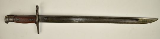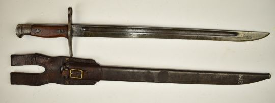 Japanese Arisaka 1897 pattern type 30 bayonet with wooden grips, 39.5cm fullered blade, scabbard and frog. PLEASE NOTE ALL BLADED ITEMS ARE SUBJECT TO OVER 18 CHECK ON COLLECTION OR DELIVERY