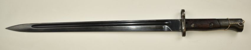 Belgian 1924 pattern sword bayonet made by Fabrique Nationale and widely exported, with 38.5cm fullered blade and steel scabbard. PLEASE NOTE ALL BLADED ITEMS ARE SUBJECT TO OVER 18 CHECK ON COLLECTION OR DELIVERY