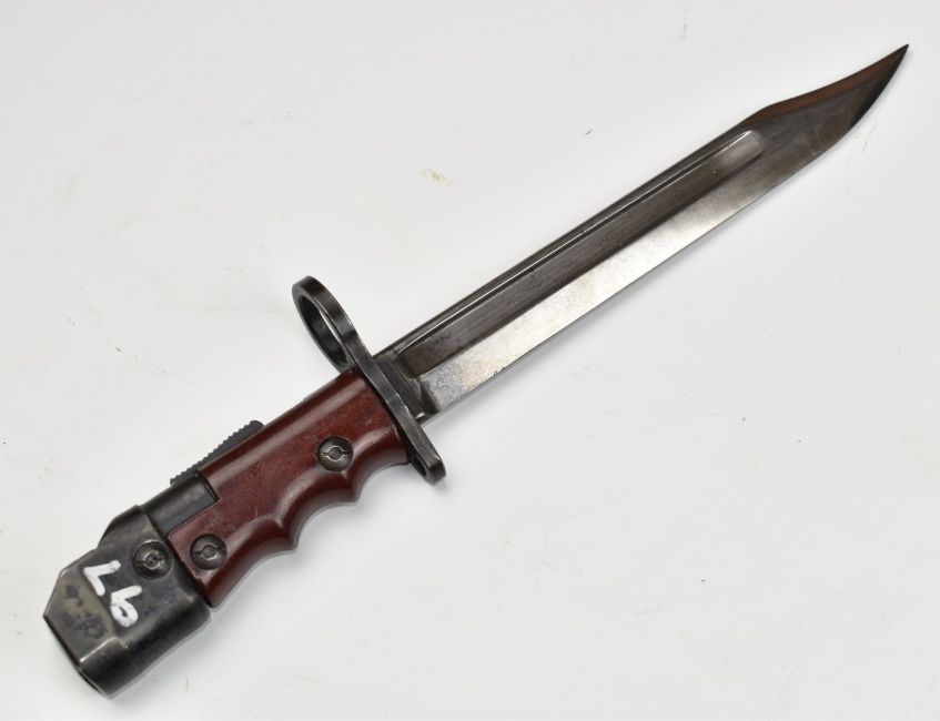 British knife bayonet number VII for the No4 rifle and Sten gun, with swivel pommel, 20cm fullered blade, scabbard and frog. PLEASE NOTE ALL BLADED ITEMS ARE SUBJECT TO OVER 18 CHECK ON COLLECTION OR DELIVERY