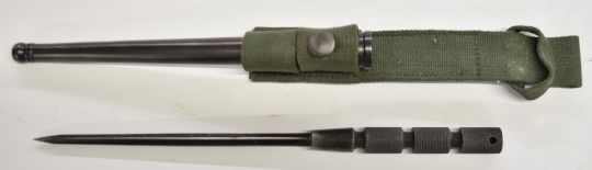 British unfinished, possibly experimental spike bayonet with 17cm cruciform blade, scabbard and frog, ink stamped to reverse with broad arrow mark, M W & S 1964 ON 2006. PLEASE NOTE ALL BLADED ITEMS ARE SUBJECT TO OVER 18 CHECK ON COLLECTION OR DELIVERY