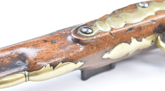 Belgian flintlock holster pistol with brass trigger guard, butt cap and mounts, wooden ram-rod, chequered grips and 8 inch smooth bored barrel, overall length 36.5cm.