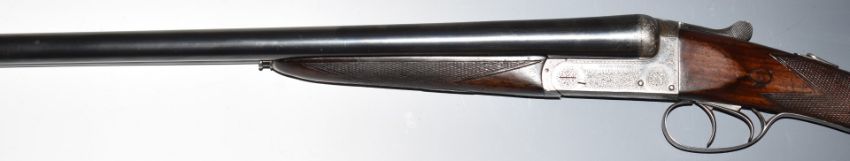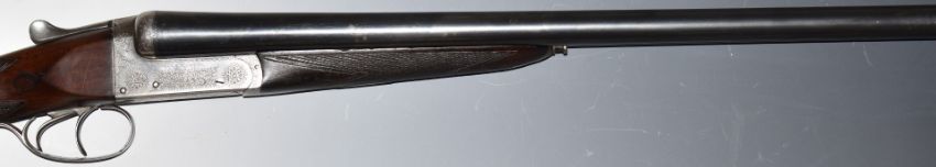 Alex Martin 12 bore side by side ejector shotgun with named and engraved locks, engraved underside, trigger guard, top plate, fences and thumb lever, chequered grip and forend, carved teardrop to the wrist, vacant cartouche to the underside of the stock, double trigger and named 26 inch barrels choked improved cylinder and ¾, overall length 117cm, length of pull 36cm, serial number 6885. PLEASE NOTE THAT A VALID RELEVANT FIREARMS/SHOTGUN CERTIFICATE IS REQUIRED TO HANDLE/PURCHASE THIS ITEM.