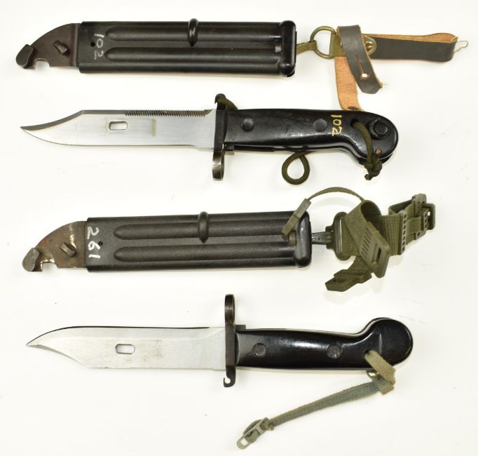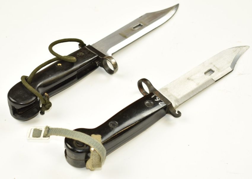 Two Russian Dragunov bayonets both with 15cm serrated blades, scabbards and frogs. PLEASE NOTE ALL BLADED ITEMS ARE SUBJECT TO OVER 18 CHECK ON COLLECTION OR DELIVERY
