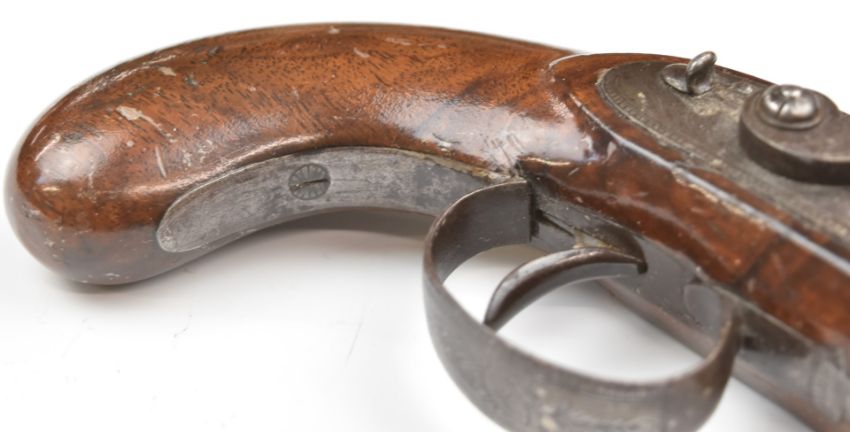 H W Mortimer of London percussion hammer action coat pistol with named and engraved stylised dolphin hammer, lock, engraved trigger guard, top plate and mounts, brass tipped wooden ram-rod, vacant wrist cartouche and named 6 inch smooth bored octagonal barrel, overall length 29.5cm.