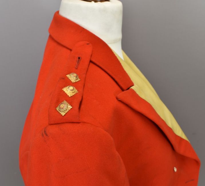 British Army Gloucestershire Regiment officer's scarlet mess jacket with yellow facings and rank insignia to one shoulder strap, with associated buttons and waistcoatConsigned by the Soldiers of Gloucestershire Museum Trust
