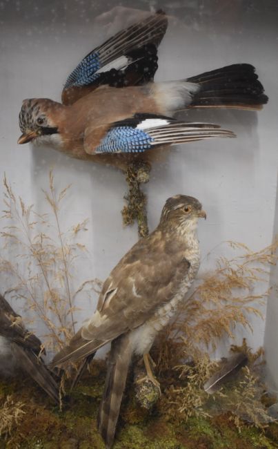 19thC taxidermy study of two sparrowhawks and two jays in glazed case, W60 x D16 x H63cm
