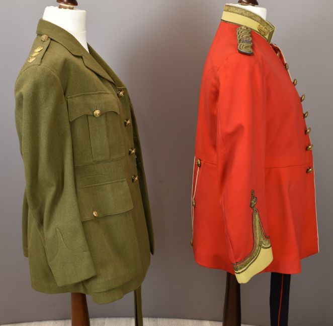 British Army Gloucestershire Regiment officer's full dress scarlet tunic with gilt collar badges and Major rank insignia to shoulder cords, attributed to Lt colonel R M Grazebook, Gloucestershire Regiment, together with a pair of trousers and two of his khaki service dress tunics and trousersConsigned by the Soldiers of Gloucestershire Museum Trust
