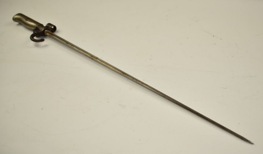 French 1886 / 93 pattern Lebel bayonet with groove in grip as for Gendarmerie issue, 52cm cruciform blade, scabbard and frog. PLEASE NOTE ALL BLADED ITEMS ARE SUBJECT TO OVER 18 CHECK ON COLLECTION OR DELIVERY