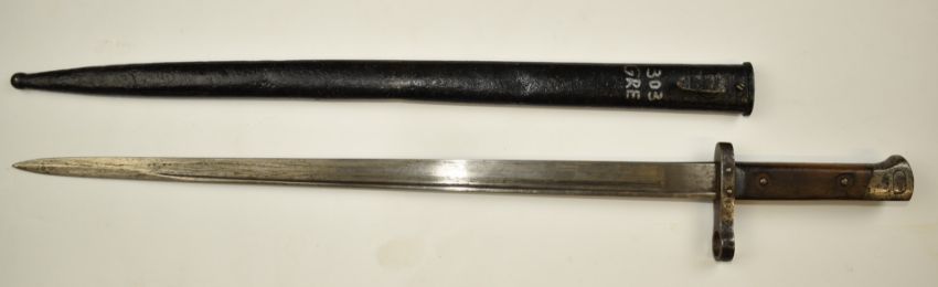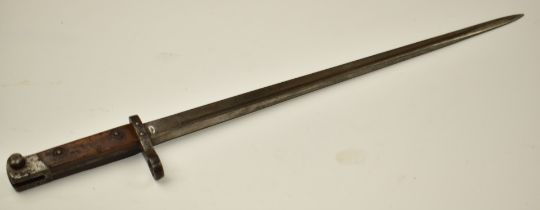 Greek 1903 pattern Mannlicher bayonet stamped A5231 to crossguard and Ereci Gnutt Lumezzan to ricasso, with 39.5cm single edged blade. PLEASE NOTE ALL BLADED ITEMS ARE SUBJECT TO OVER 18 CHECK ON COLLECTION OR DELIVERY