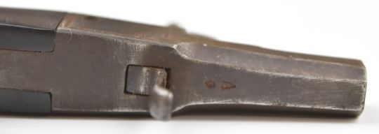 Miniature percussion hammer action pocket pistol with line engraved lock, wooden grips and 1 inch octagonal barrel, overall length 8.5cm.