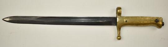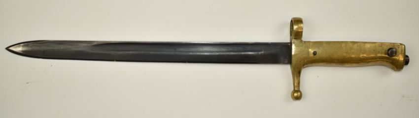 Italian 1870/1887 pattern bayonet with all brass grip and crossguard stamped UX9683, 30cm fullered blade, scabbard and frog. PLEASE NOTE ALL BLADED ITEMS ARE SUBJECT TO OVER 18 CHECK ON COLLECTION OR DELIVERY