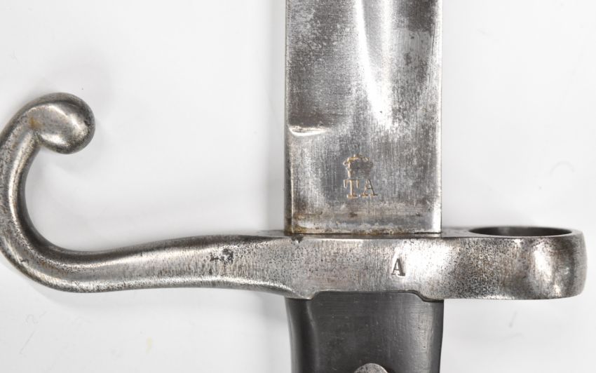 Italian 1870 pattern Vetterli bayonet stamped UU4599 to crossguard and TA to ricassso, with 52cm fullered blade with scabbard and frog. PLEASE NOTE ALL BLADED ITEMS ARE SUBJECT TO OVER 18 CHECK ON COLLECTION OR DELIVERY