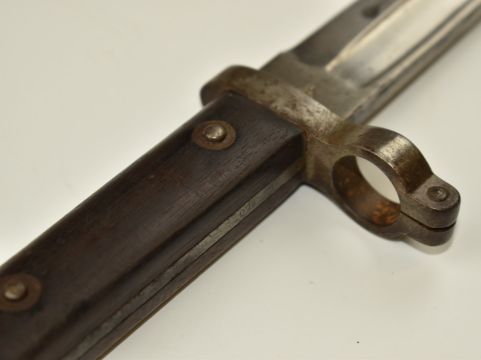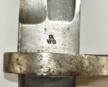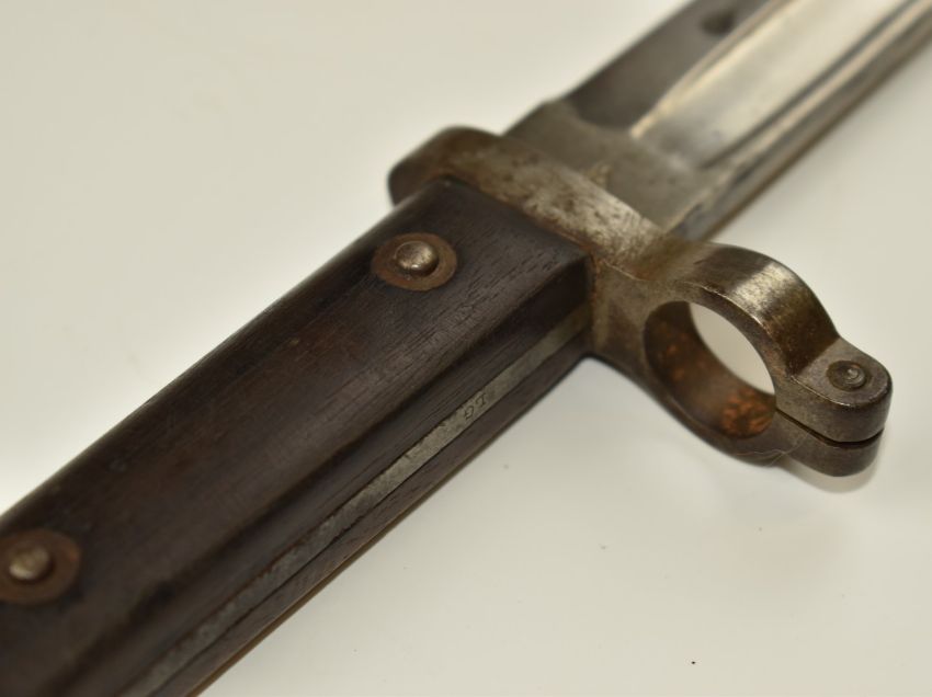 Austrian 1886 pattern Mannlicher bayonet stamped CE over WG to ricasso with 24.5cm fullered blade, scabbard and frog. PLEASE NOTE ALL BLADED ITEMS ARE SUBJECT TO OVER 18 CHECK ON COLLECTION OR DELIVERY