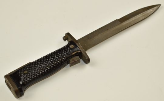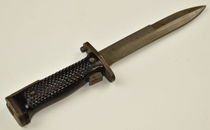 Danish 1955 pattern bayonet with chequered grips, 17cm blade, wooden scabbard marked HTK and frog. PLEASE NOTE ALL BLADED ITEMS ARE SUBJECT TO OVER 18 CHECK ON COLLECTION OR DELIVERY