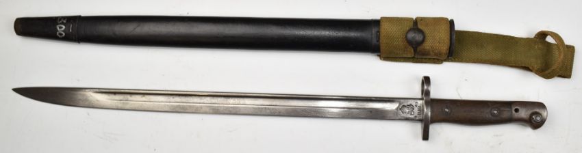 British 1907 pattern Indian made Lee Enfield bayonet with good stamps to ricasso, a 43cm fullered blade, scabbard and frog. PLEASE NOTE ALL BLADED ITEMS ARE SUBJECT TO OVER 18 CHECK ON COLLECTION OR DELIVERY