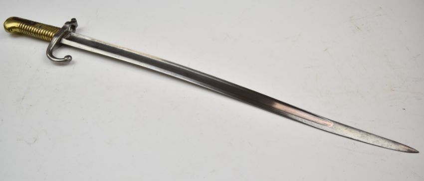 Belgian 1868 pattern yataghan bayonet, 1869 to ricasso and R 4512 to cross guard with 57.5cm fullered blade and scabbard. PLEASE NOTE ALL BLADED ITEMS ARE SUBJECT TO OVER 18 CHECK ON COLLECTION OR DELIVERY