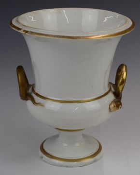 19thC Derby porcelain twin-handled pedestal vase with flower decoration and a pair of porcelain pot pourri, tallest 18cm