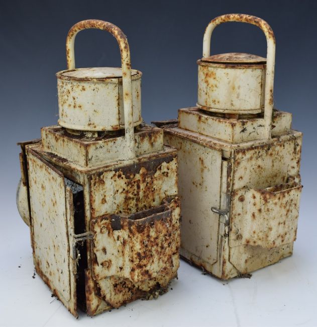 Two British Railways Midland region steam railway locomotive or similar hand lamps with brackets to rear, height 33cm