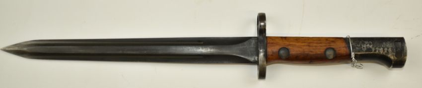 Belgian bayonet for use with the FN 1949 SLR, marked SA 30 77326 to pommel, with 23cm double edged blade and scabbard. PLEASE NOTE ALL BLADED ITEMS ARE SUBJECT TO OVER 18 CHECK ON COLLECTION OR DELIVERY