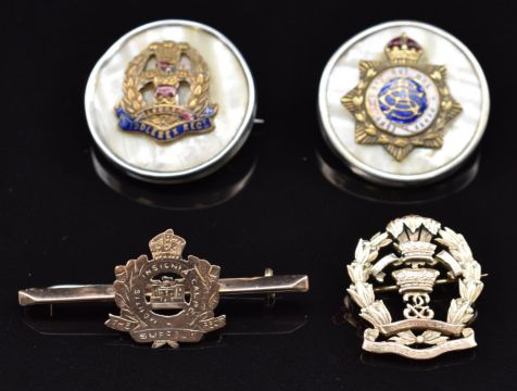 Two mother of pearl and enamel sweetheart brooches for the Army Service Corps and Middlesex Regiment together with Middlesex Regiment and Suffolk Regiment yellow metal brooches, total weight of Middlesex and Suffolk brooches 7.8g