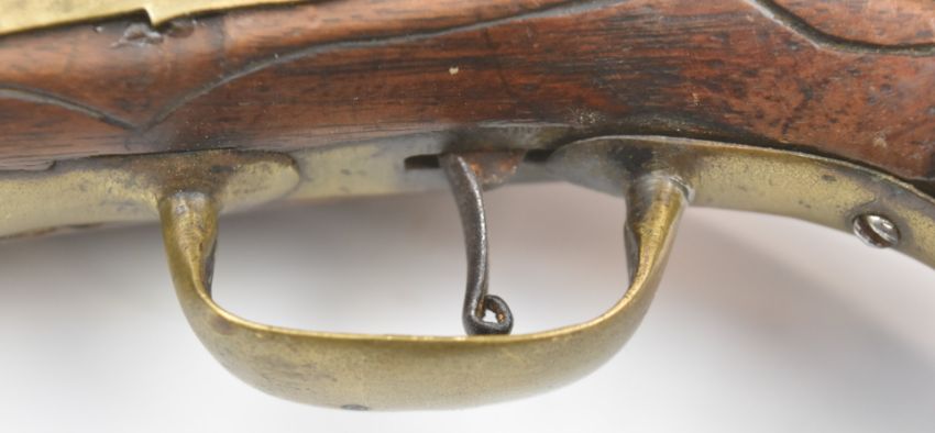 Percussion converted from flintlock hammer action coat pistol with carved decoration, vacant wrist cartouche, brass trigger guard and mounts, steel ram-rod and 4.5 inch smooth bored part octagonal brass cannon barrel, overall length 26cm.