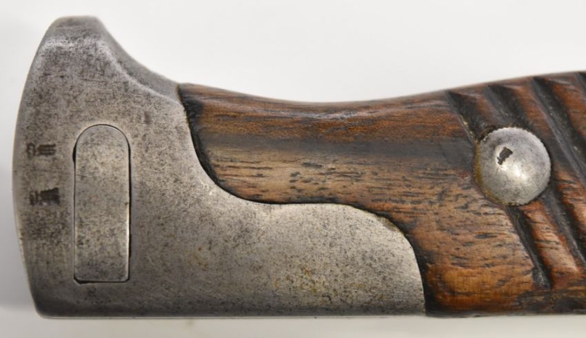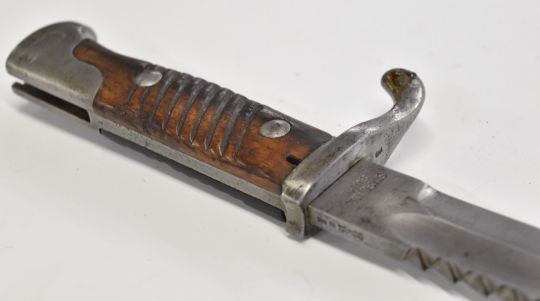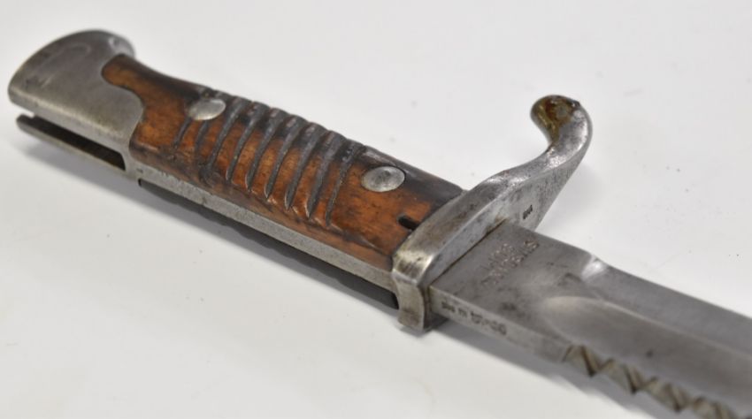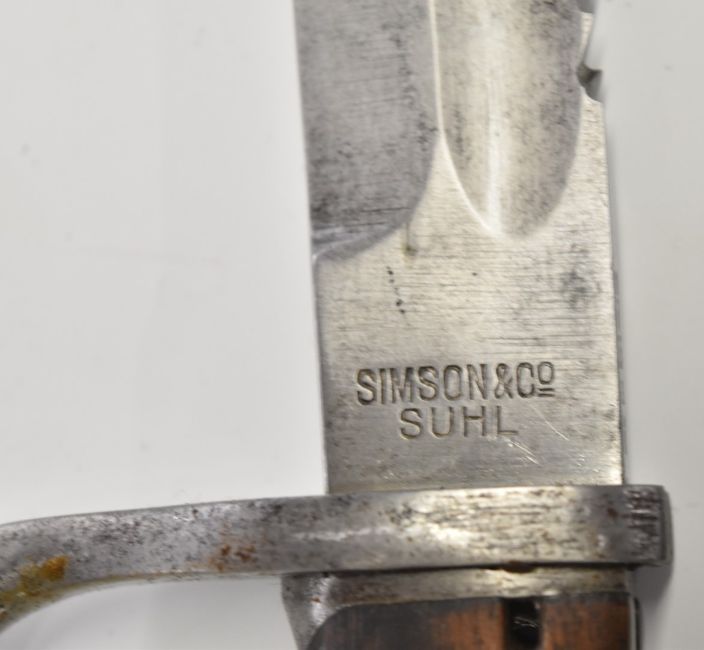 German WW1 sawback butcher's bayonet with wooden grips, Simpson & Co Suhl to ricasso, 37cm sawback blade, scabbard and frog. PLEASE NOTE ALL BLADED ITEMS ARE SUBJECT TO OVER 18 CHECK ON COLLECTION OR DELIVERY
