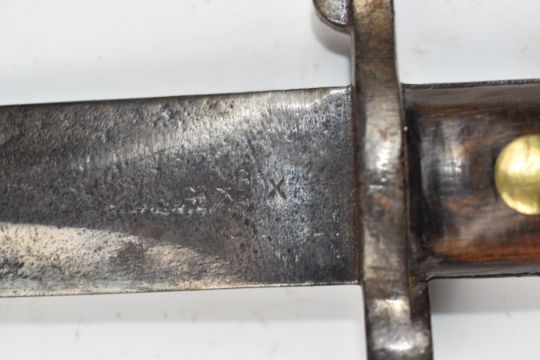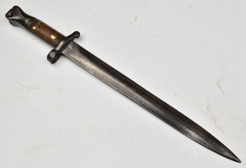 British 1888 pattern bayonet Mk I type 1, with some clear stamps to ricasso, a 30cm double edged blade, scabbard and Slade Wallace frog. PLEASE NOTE ALL BLADED ITEMS ARE SUBJECT TO OVER 18 CHECK ON COLLECTION OR DELIVERY