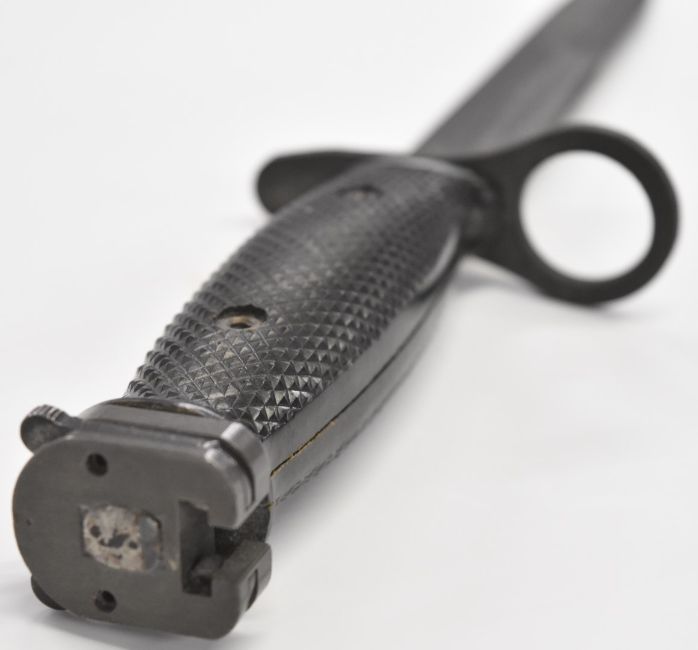 American M7 pattern bayonet with chequered grip, 17cm blade, scabbard and belt hook. PLEASE NOTE ALL BLADED ITEMS ARE SUBJECT TO OVER 18 CHECK ON COLLECTION OR DELIVERY