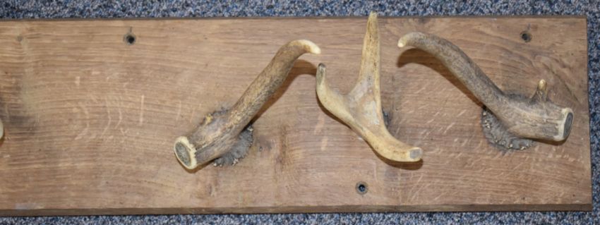 Taxidermy deer antler coat rack on a substantial elm/oak mount, W153 x D18cm