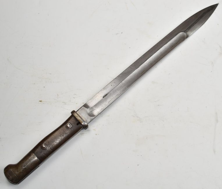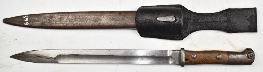German 1898 pattern export model bayonet stamped Samson Werk to ricasso, with 31.5cm fullered blade, scabbard and frog. PLEASE NOTE ALL BLADED ITEMS ARE SUBJECT TO OVER 18 CHECK ON COLLECTION OR DELIVERY