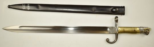 Argentinian 1891 pattern sword bayonet with brass grips, 40cm fullered blade, good stamps including Mondelo Argentino 1891, matching serial number C8400 and scabbard. PLEASE NOTE ALL BLADED ITEMS ARE SUBJECT TO OVER 18 CHECK ON COLLECTION OR DELIVERY