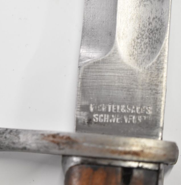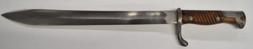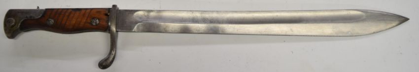 German WW1 butcher's bayonet with wooden grips, flashguard, Fitchell & Sachs to ricasso, 37cm blade, scabbard and frog. PLEASE NOTE ALL BLADED ITEMS ARE SUBJECT TO OVER 18 CHECK ON COLLECTION OR DELIVERY
