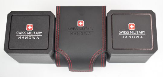 Three Hanowa Swiss military gentleman's wristwatches one ref. 6-4292 and two ref. 6-4281, all in original boxes with outer sleeves, tags and related paperwork.