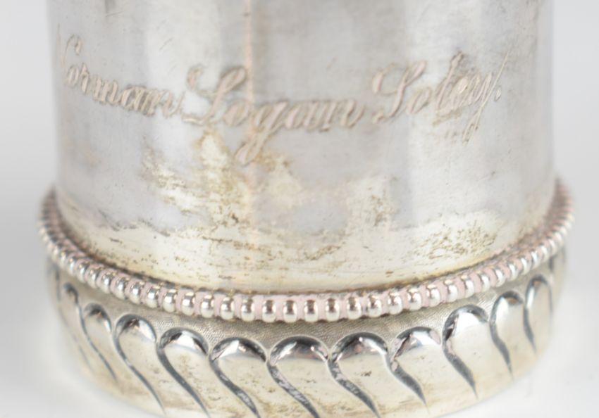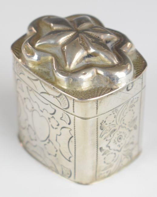 Continental and similar silver items comprising Russian enamel decorated salt, christening mug marked sterling, Dutch silver trinket pot, tea strainer marked sterling and a Dutch silver scoop or spoon, weight of all items 155g