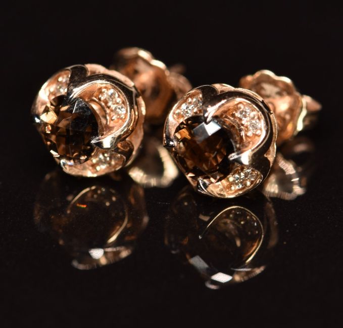A 14k rose gold ring set with smoky quartz and diamonds, with matching earrings, 7g