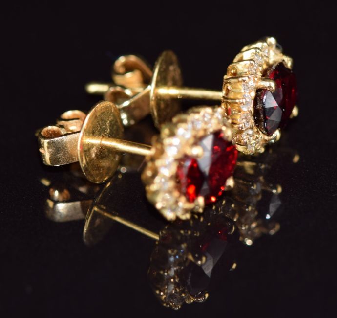 A pair of 18ct gold earrings each set with an oval cut ruby of approximately 0.7ct surrounded by diamonds, 9.7g