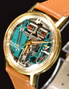 Bulova Accutron Spaceview gentleman's wristwatch with gold hands, silver inner bezel, gold plated case and calibre 214 electronic movement, on tan leather strap, case diameter 35mm, serial number 1-479109, in original box with related paperwork.