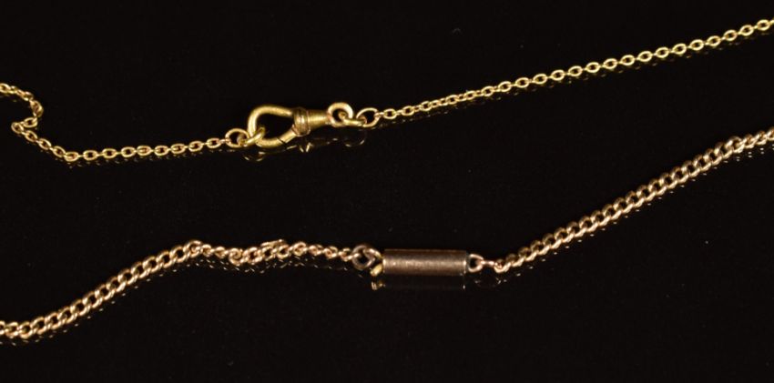 A c1900 9ct gold chain and yellow metal fob chain, length of longer 48cm, weight of both 5.5g