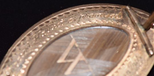 Duke of Wellington interest:- Georgian rose gold marquise shaped pendant / brooch set with hair within white and blue enamel border with a single row of seed pearls to the outer edge, verso a glass compartment with central letter 'W' in gold, engraved to the border 'Dearest Harriet as promised Society has declared me Iron Duke',9.7g, 3.7 x 2.4cm.Believed to be originally given as a gift from the Duke of Wellington to his close friend Harriet Arbuthnot, English diarist (1793-1834)