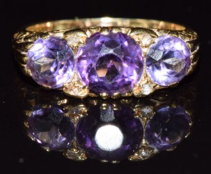 A c1920 18ct gold ring set with three amethysts and four rose cut diamonds, 5.2g, size L