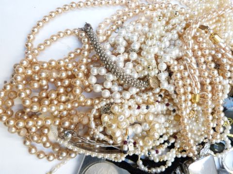 A collection of costume jewellery including watches, Japanese lacquer box, West brooch, Hollywood brooch, banknotes, beads, brooches, etc